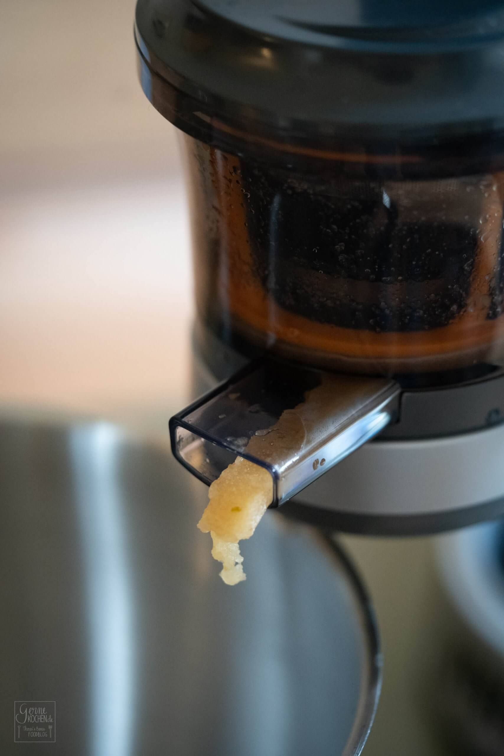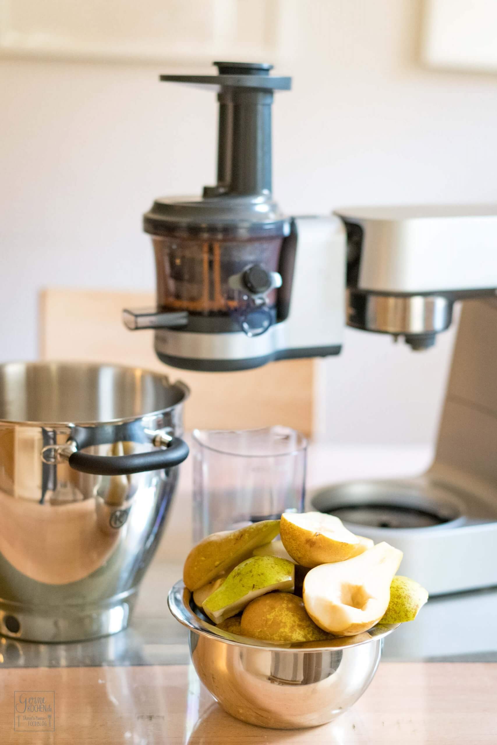 • Die Kenwood Cooking Chef Gourmet auf Geschwindigkeit 6 stellen und nach und nach die Birnen durch den Slow Juicer geben. Den Saft natürlich auffangen.