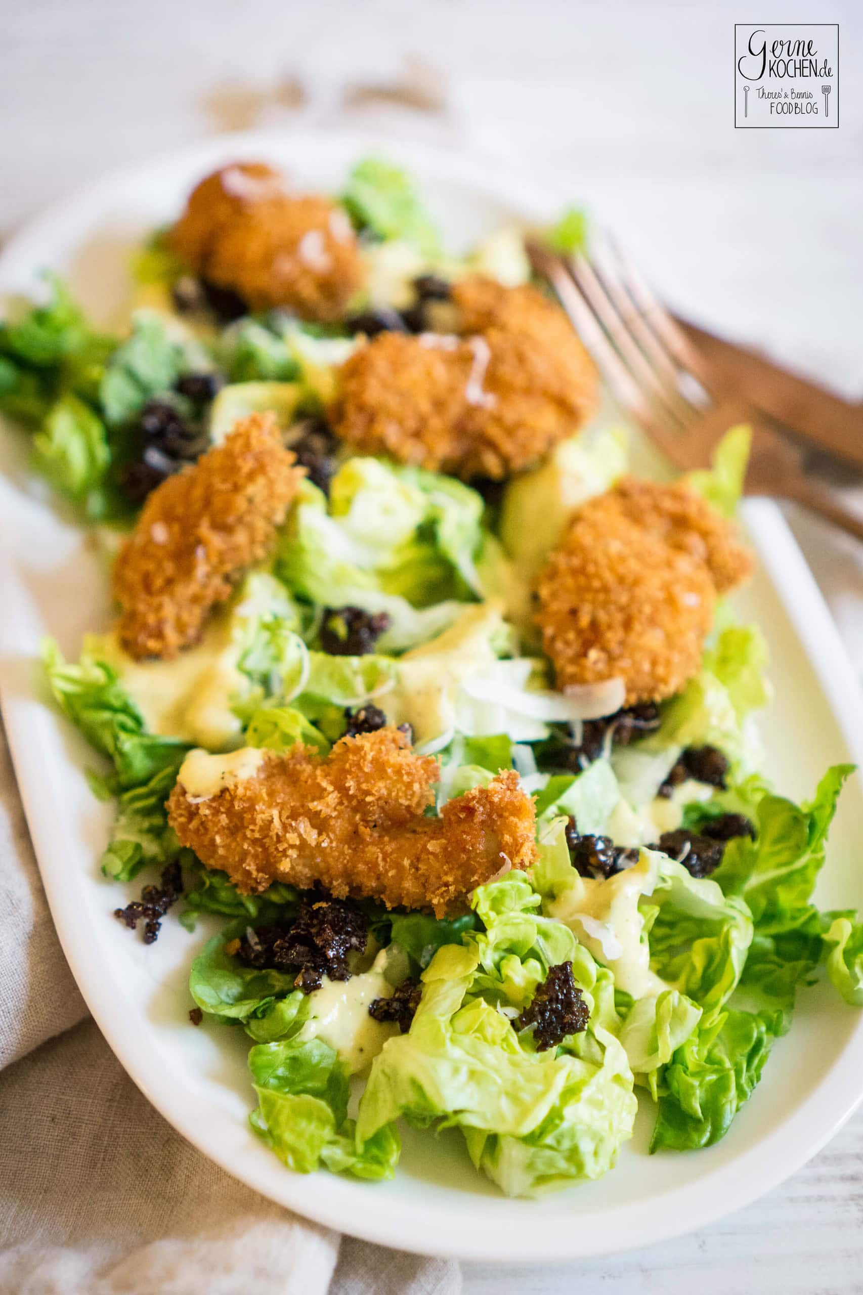 - Den geschnittenen Salat auf einen Teller geben und dann den gegrillten Salat dazu… Dressing verteilen, die Nuggets dazu, frischen Parmesan darüber hobeln und die Croutons verteilen.