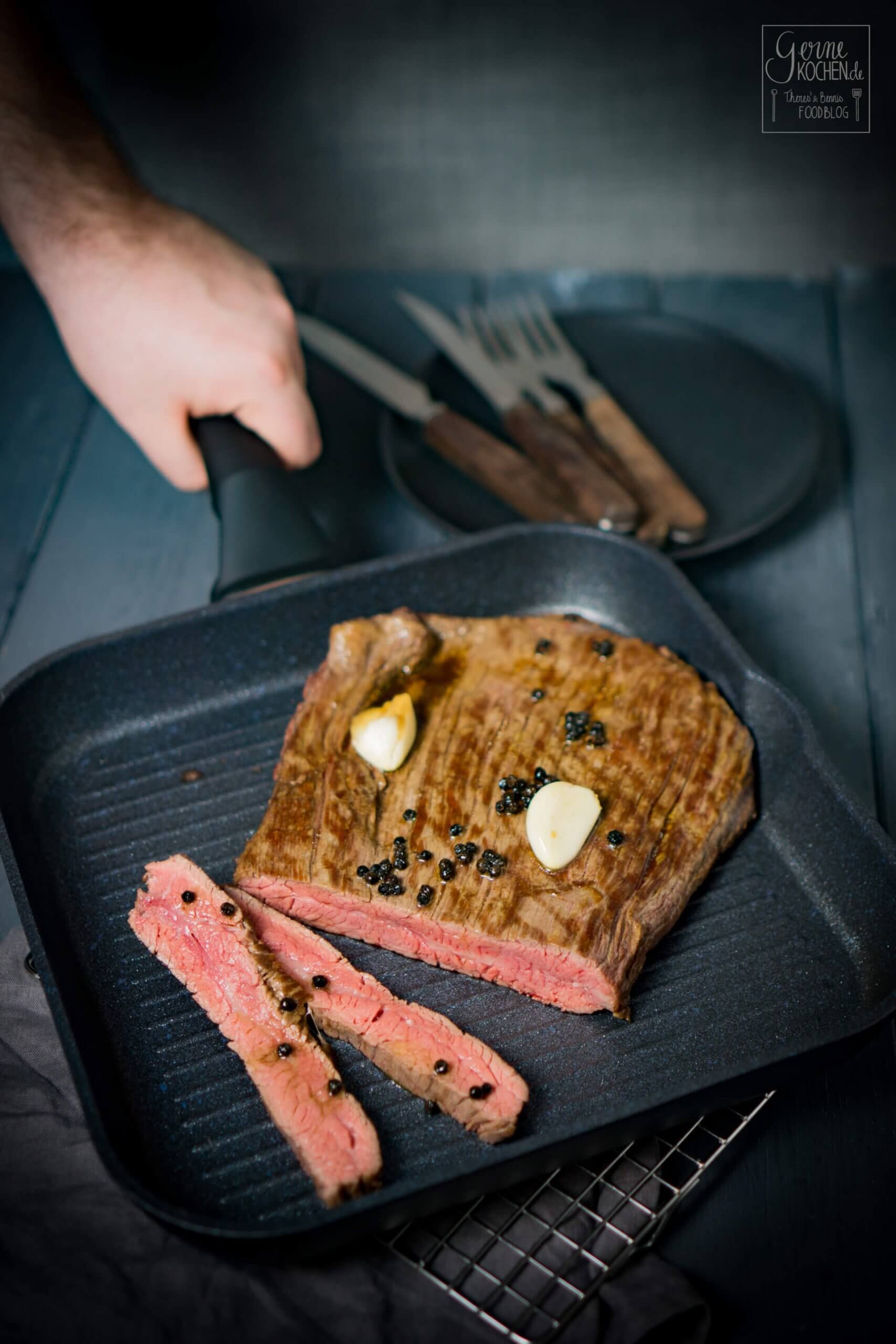 Jetzt aber zum Rezept für das Flanksteak! Die Variante ist absolut gelingsicher und benötigt neben der Pfanne und dem Flanksteak, nur 4 weitere Zutaten und am besten auch ein Grillthermometer.