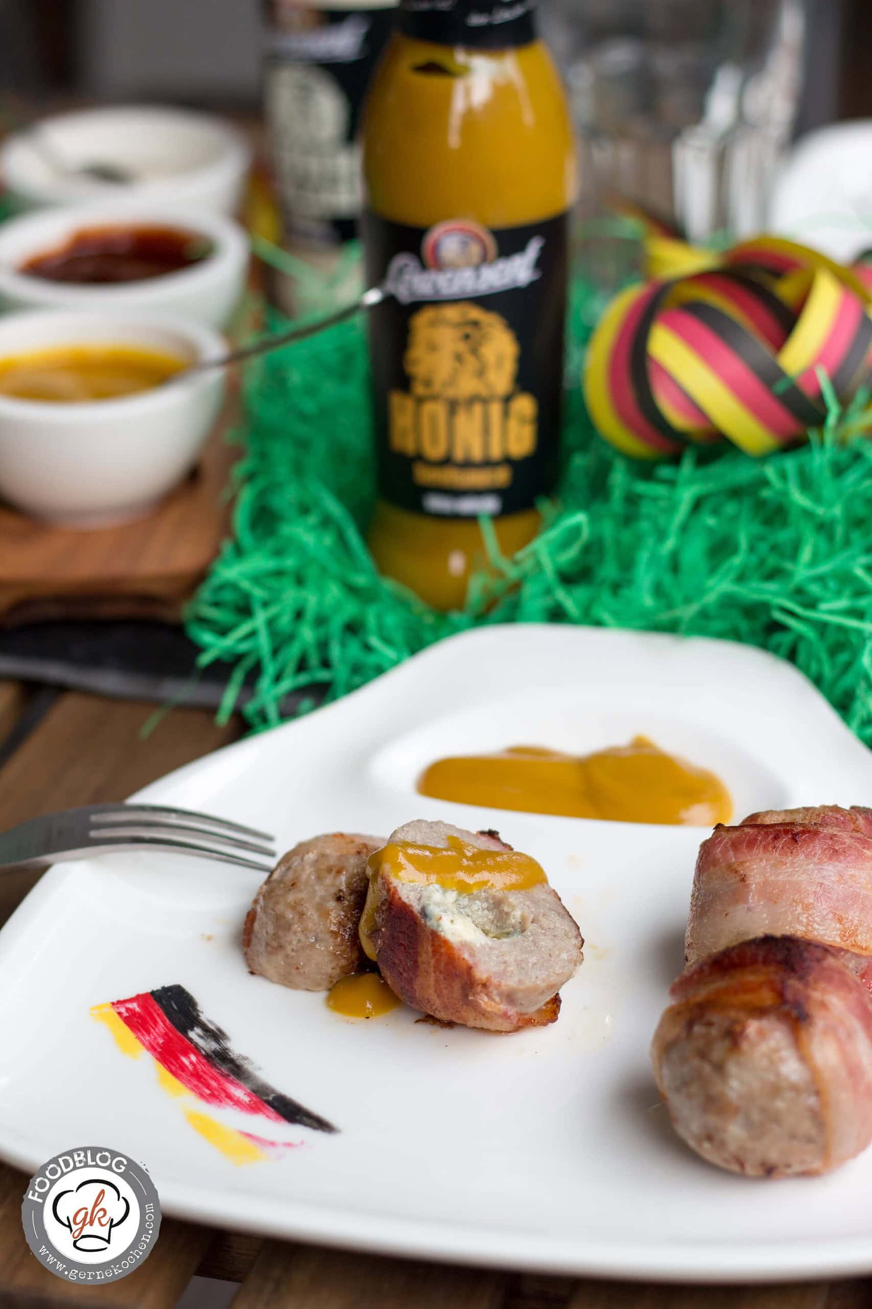 Wer mag, kann auch gerne einen anderen Blauschimmelkäse oder ganz anderen Käse verwenden. Wir dachten uns einfach, wir wollen das Gastgeberland der EM nicht vernachlässigen und zusammen mit der Honig-Senf-Sauce von Löwensenf schreien eure Geschmacksknospen nach mehr ;-). Da die Bratwürste zudem schon gewürzt sind, spart ihr euch auch diesen Schritt.