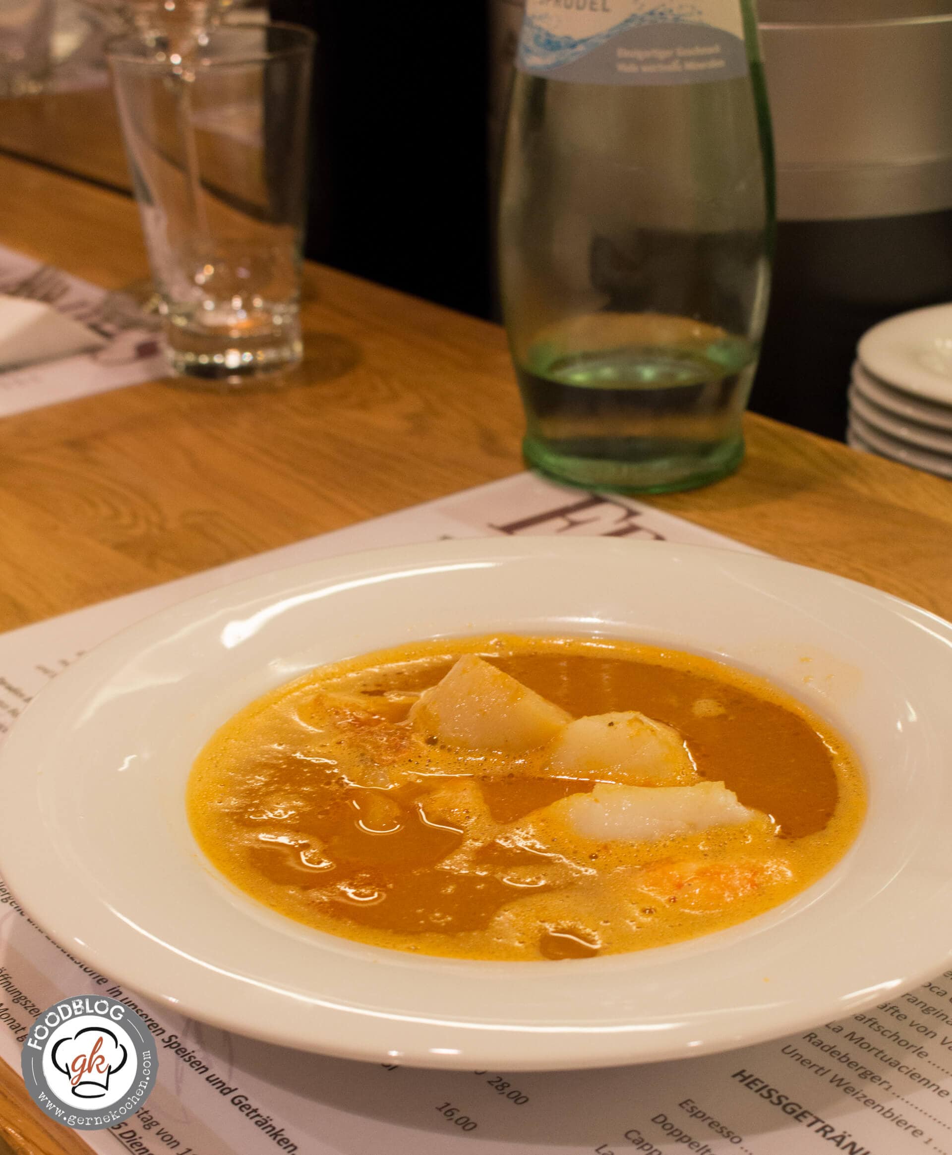 Daniel lud uns dann noch in das Paradieseigene kleine Restaurant/Kantine ein, und es gab eine tolle Bouillabaisse. Während des Essens sprachen wir über Daniels Karriere, den Blog, wie man eine Küche führt. Daniel hat seine Lehre schon bei Mövenpick gemacht, allerdings im Restaurant Mövenpick im Europa-Center (das Restaurant gibt es heute nicht mehr). Mit einer kurzen Pause ist er bereits seit über einem Jahrzehnt bei Mövenpick und man merkt ihm an, wie sehr er sich mit der Möwe identifiziert. Wenn nicht irgendwann Daniel auf die Uhr geschaut hätte, und dabei entdeckte, dass wir uns ganz schön verquatscht hatten, wären wir mit Sicherheit noch länger dort gesessen. Aber nun ging es weiter Richtung Ku’damm und den Weinen.