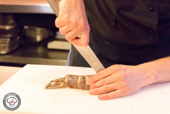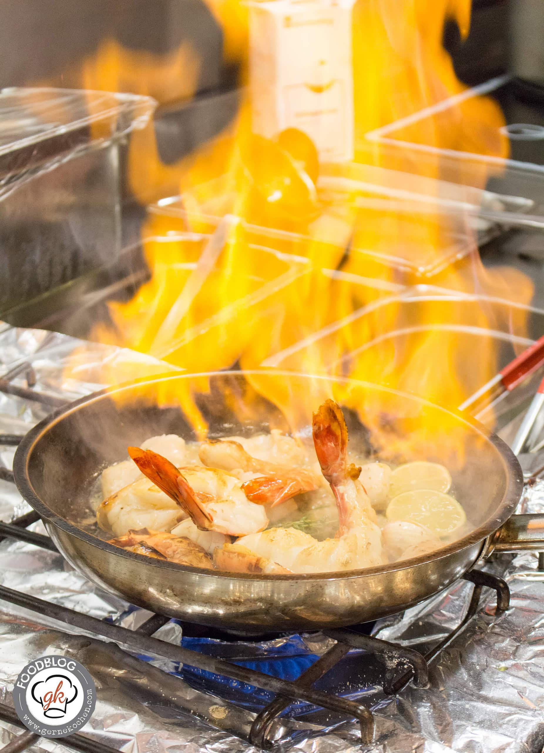 Dann wurden wir in die Küche geführt und das gesamte Team einmal vorgestellt. Daniel hat da echt ein paar tolle Leute um sich, die genauso für ihren Beruf brennen wie er. Mit Steve, Daniels rechte Hand, haben wir uns dann daran gemacht die Speisen vorzubereiten. Benni hat die Crevette, eine davon war auch wirklich sehr monströs, auseinandergenommen und die Seeteufelbäckchen vorbereitet. Ich durfte die Süßkartoffel schälen und zu Pommes schneiden (Jungs, ihr braucht einen neuen Sparschäler, dringend!), den Wildspargel und die Feigen zuschneiden. Anschließend haben wir zugeschaut, wie die Crevettes flambiert wurden und nahmen dann im Restaurant Platz.
