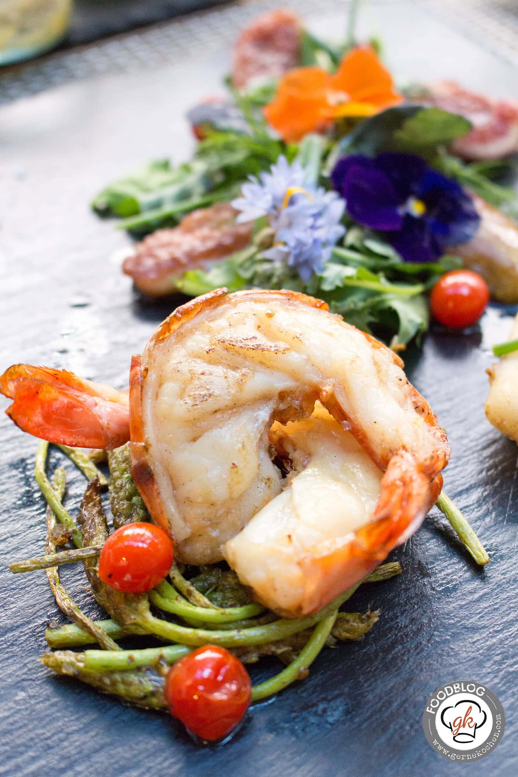 Vorspeise: Wildkräutersalat mit Crevette und Seeteufelbäckchen, wilder Spargel, Feigen und Tomberrys;