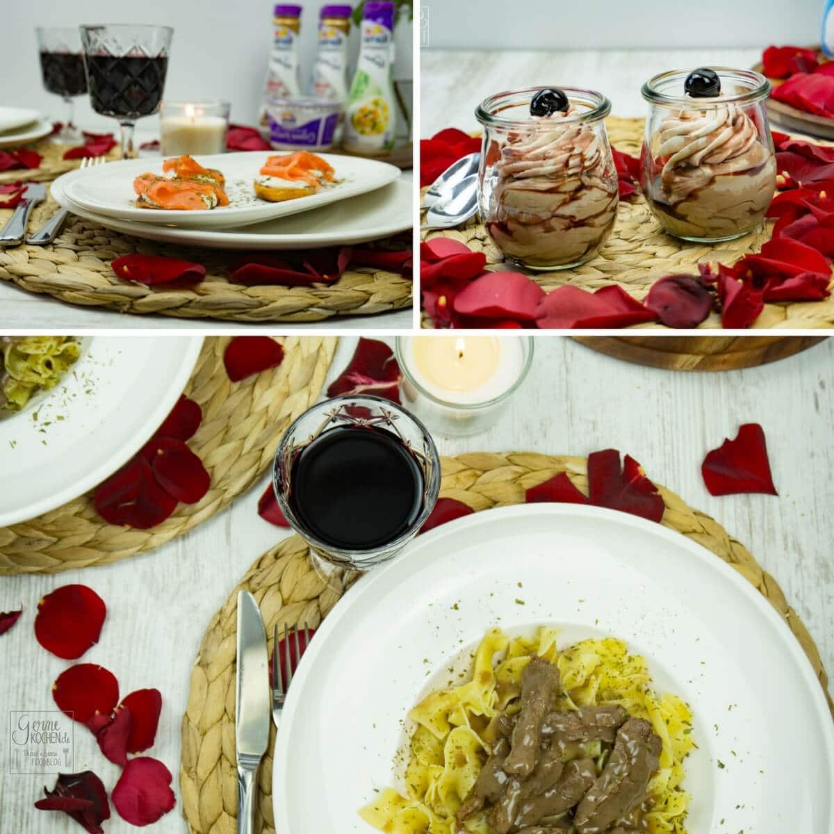 „Kreiert ein Valentinstags Menü mit drei Gängen und jeweils nur drei Hauptzutaten, wovon eines ein Rama Cremefine Produkt sein soll.“
