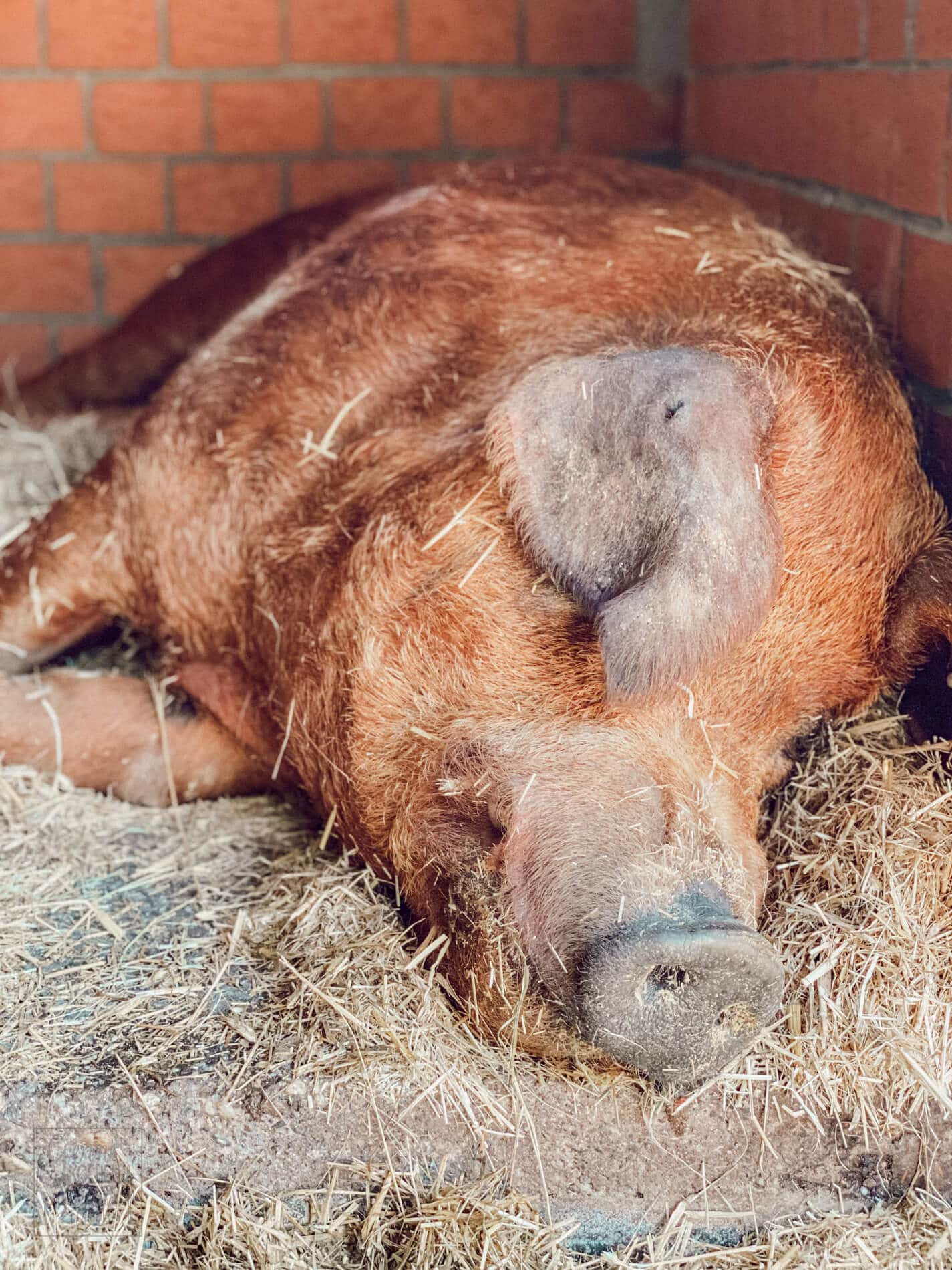 Fangen wir mit den Schweinen einmal an. Das war nämlich der erste Teil unseres Besuches. Wir sind direkt in den Schweinestall gegangen und soll ich euch mal was verraten: Die Schweine haben Fußbodenheizung! Ja, unglaublich aber wahr, die Schweinis haben warme Füße. Neben dem Schweinestall liegt die hofeigene Bäckerei. Mitten in der Nacht wird dort der Ofen angefeuert und zwar so heiß, dass nach dem Abbacken aller Spezialitäten die restliche Wärme in den Schweinestall geleitet wird. Und wenn ihr euch einmal Helmut anschaut (das ist der Chef bei den Damen), dann ist wohl klar, dass es ihm damit saugut geht.