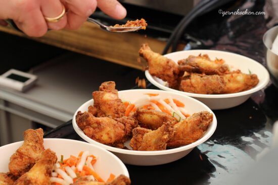 Der nächste Halt war bei den Jungs der Straßenküche, die Chicken Wings im Angebot hatten. Und, soviel sei schon mal vorweggenommen, einen Hammer-Beilagensalat dazu gezaubert haben. Der hat mich am meisten begeistert. Die Chicken Wings waren ganz simpel im Salt&Pepper-Style (mit 4 Pfeffersorten) gewürzt. Durch ihre Einfachheit haben sie aber toll geschmeckt. Im Gespräch mit den beiden, erzählten sie, dass das Hähnchen, welches sie verwenden, aus der Umgebung kommt und es eigentlich sogar Demeter-Qualität besitzt, welches sie aber nicht mit Siegeln bewerben. Wahlweise kann man die Wings mit Sweet-Chili oder Honig Ingwer Sauce bestellen. Beide Varianten sind absolut empfehlenswert.
