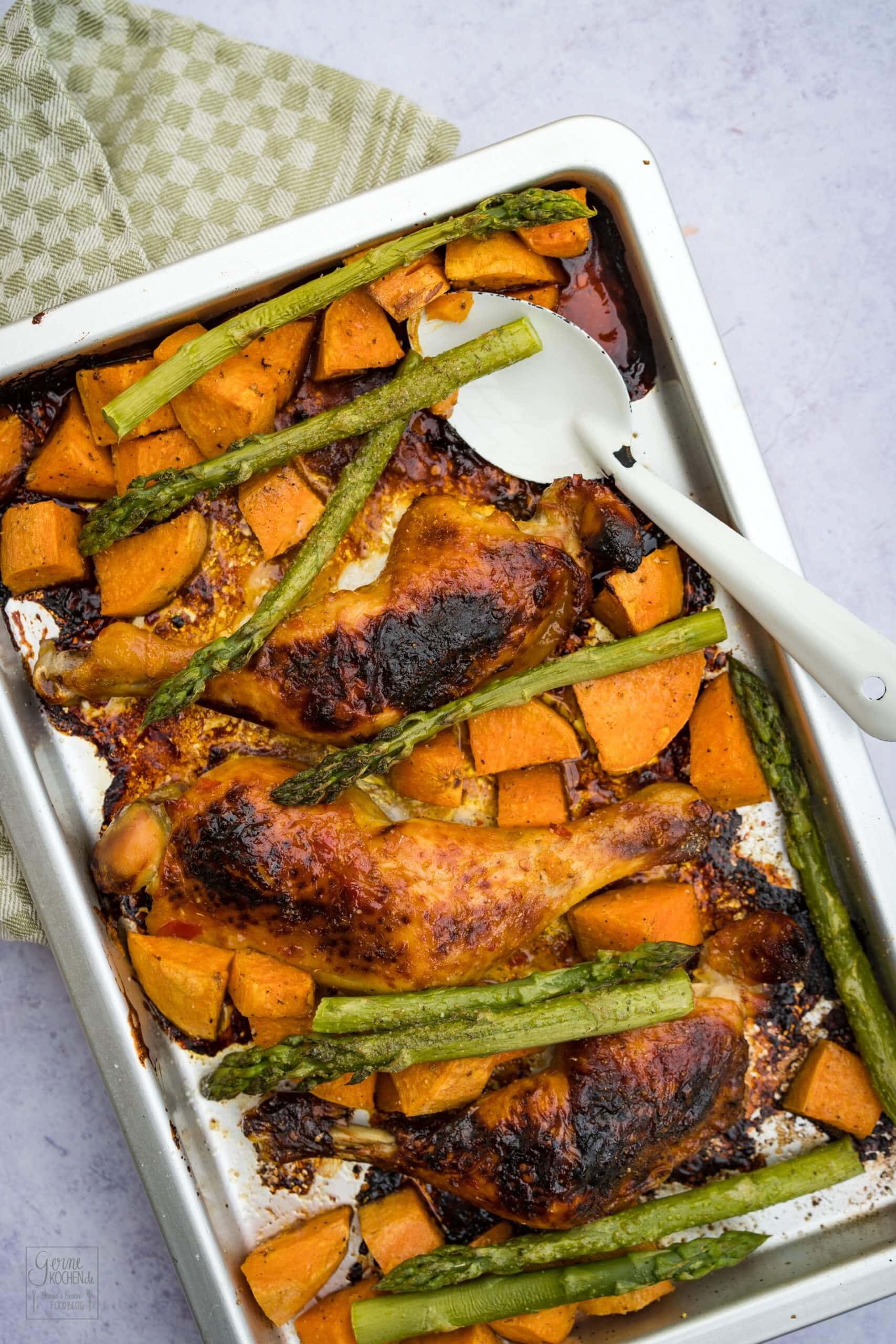 All in One Blech: Hähnchenschenkel mit Süßkartoffeln und grünem Spargel