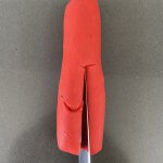 • Für den Kopf setzt du zwei Einschnitte im oberen Viertel der Rolle, und etwas oberhalb der Mitte machst du einen weiteren Schnitt für die Arme, ähnlich dem für den Kopf.