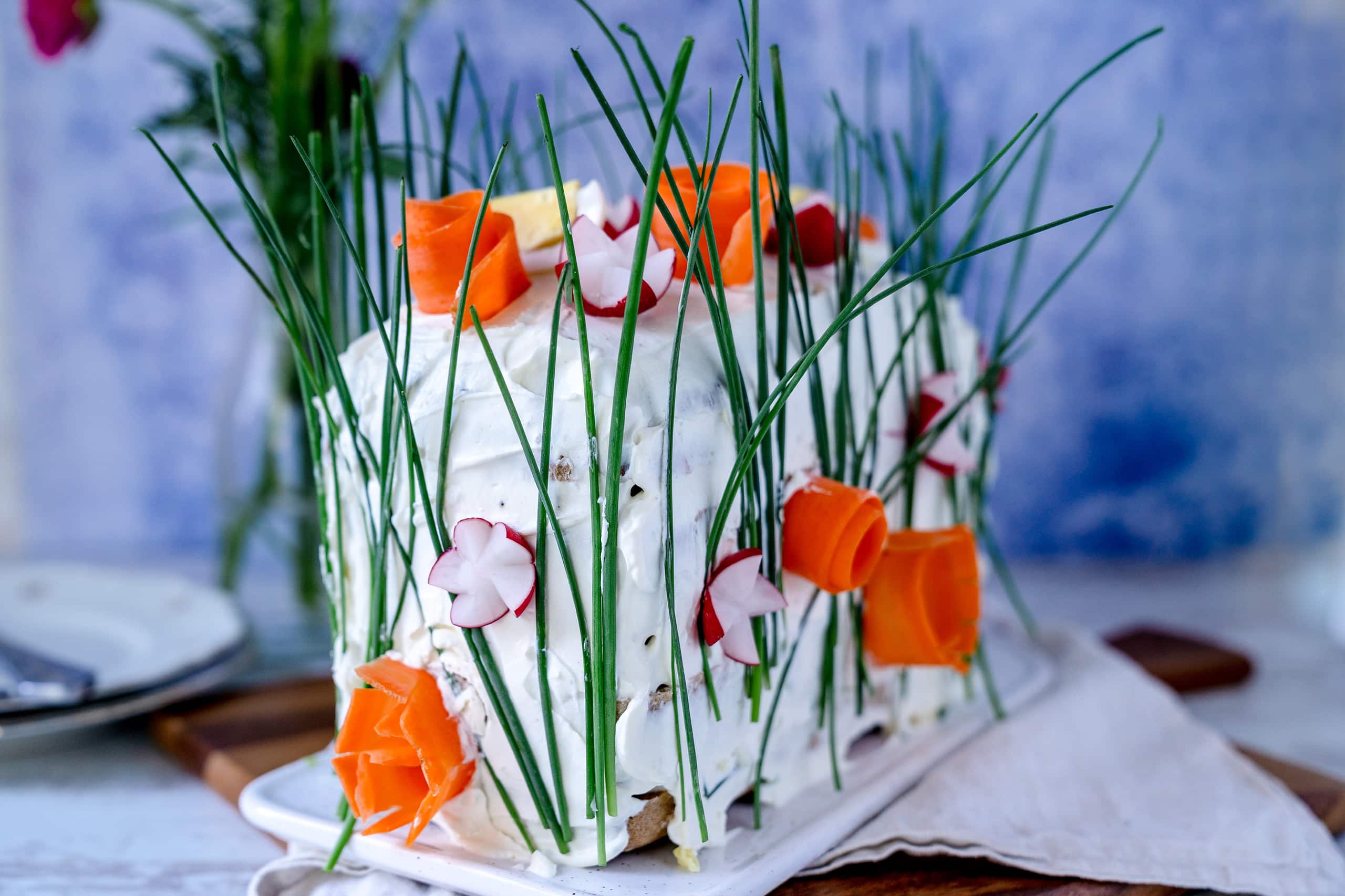 Wenn ihr alles belegt habt und der Deckel auf dem Brot sitzt, dann streicht ihr sie rundherum mit Frischkäsecreme ein. Das muss gar nicht sonderlich dick sein, sondern reicht, wenn das Brot gut verdeckt ist. Dann geht es ans Verzieren.