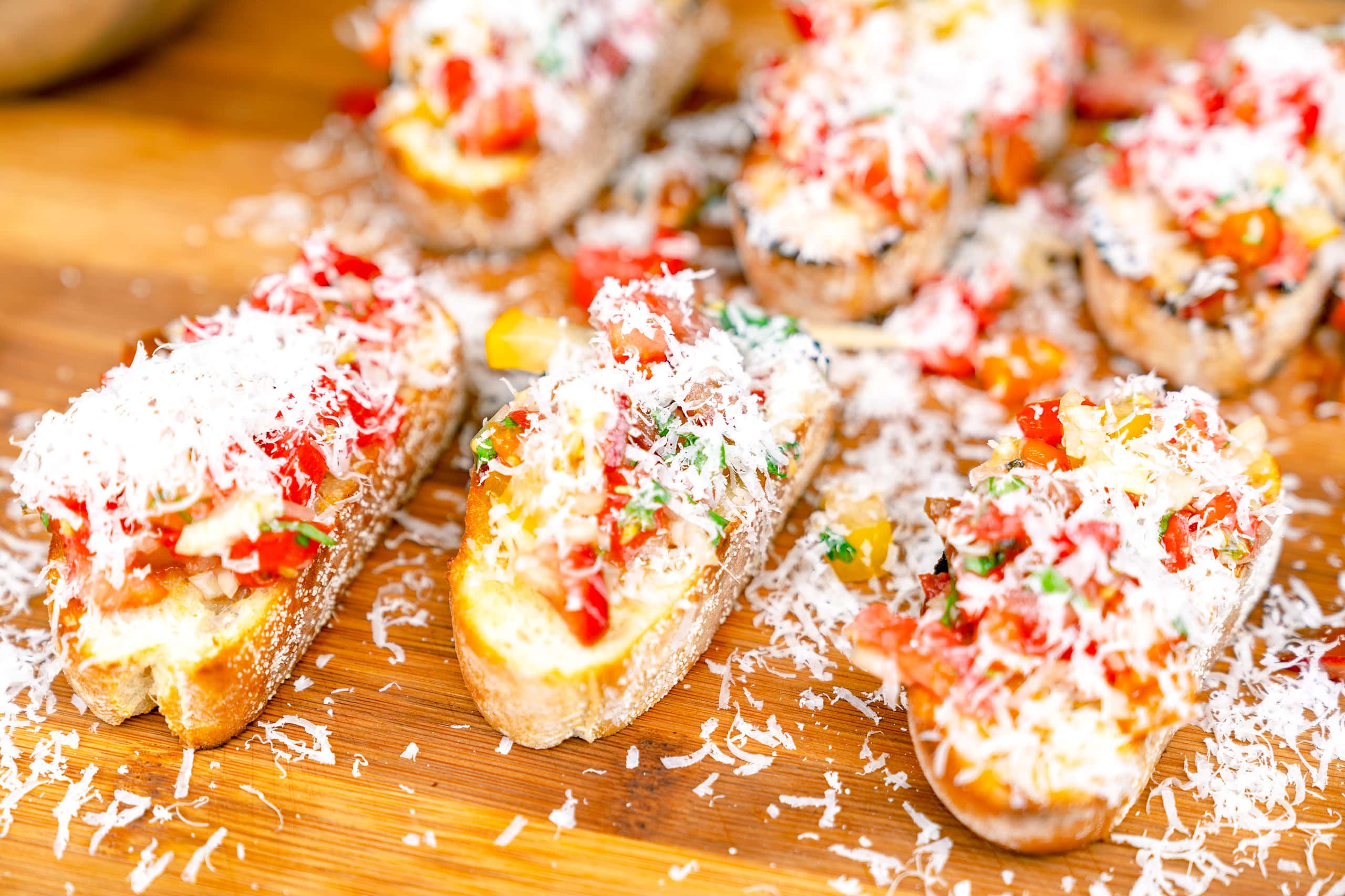 Tomaten auf dem gerösteten Brot verteilen, Parmesan darüber reiben und servieren