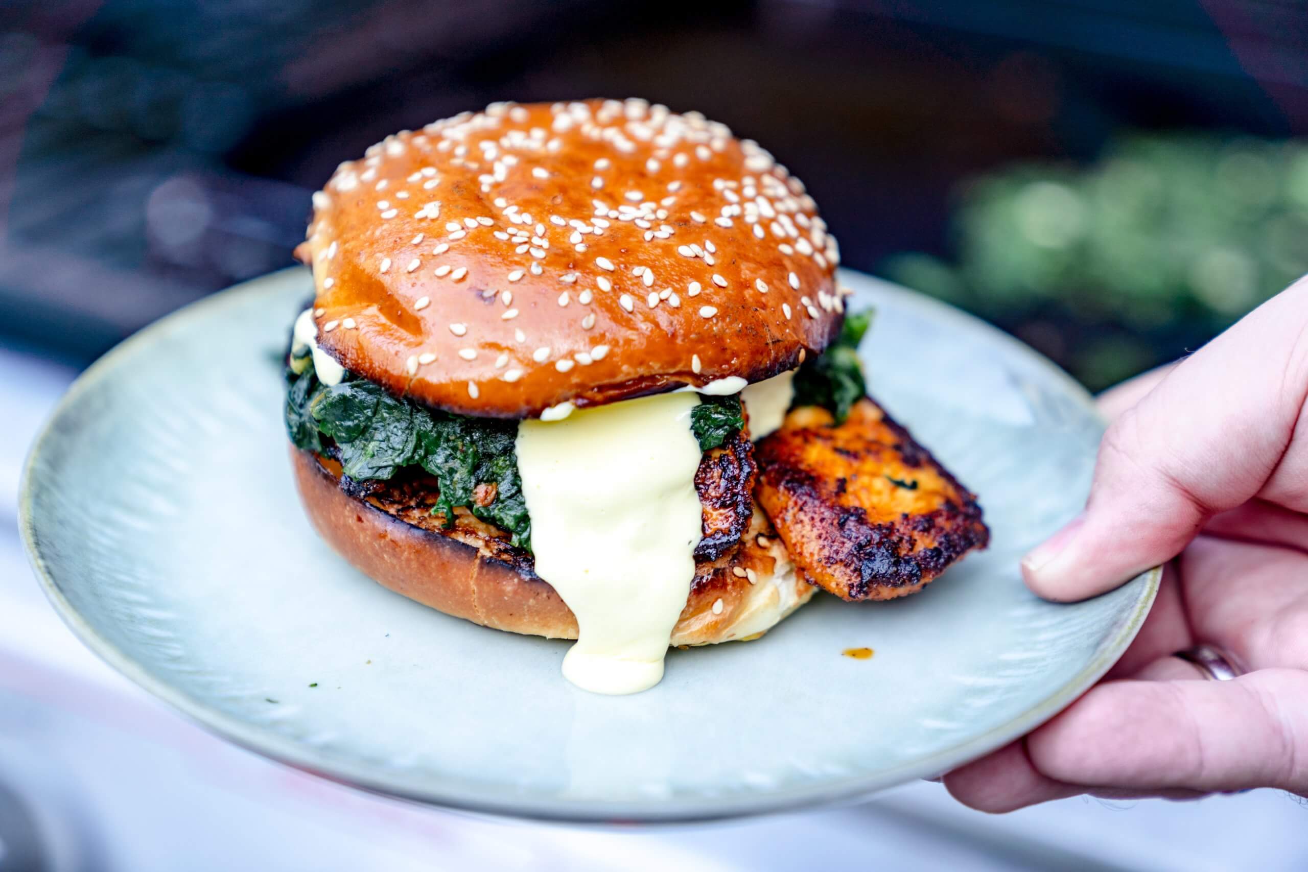 Jetzt kann der Burger zusammengebaut werden! Auf den Bun kommt die Hähnchenbrust, darauf der Knoblauch-Spinat und zum Schluß Sauce Hollandaise und der Deckel. Fertig ist der Chickenburger mit Knoblauch-Spinat.