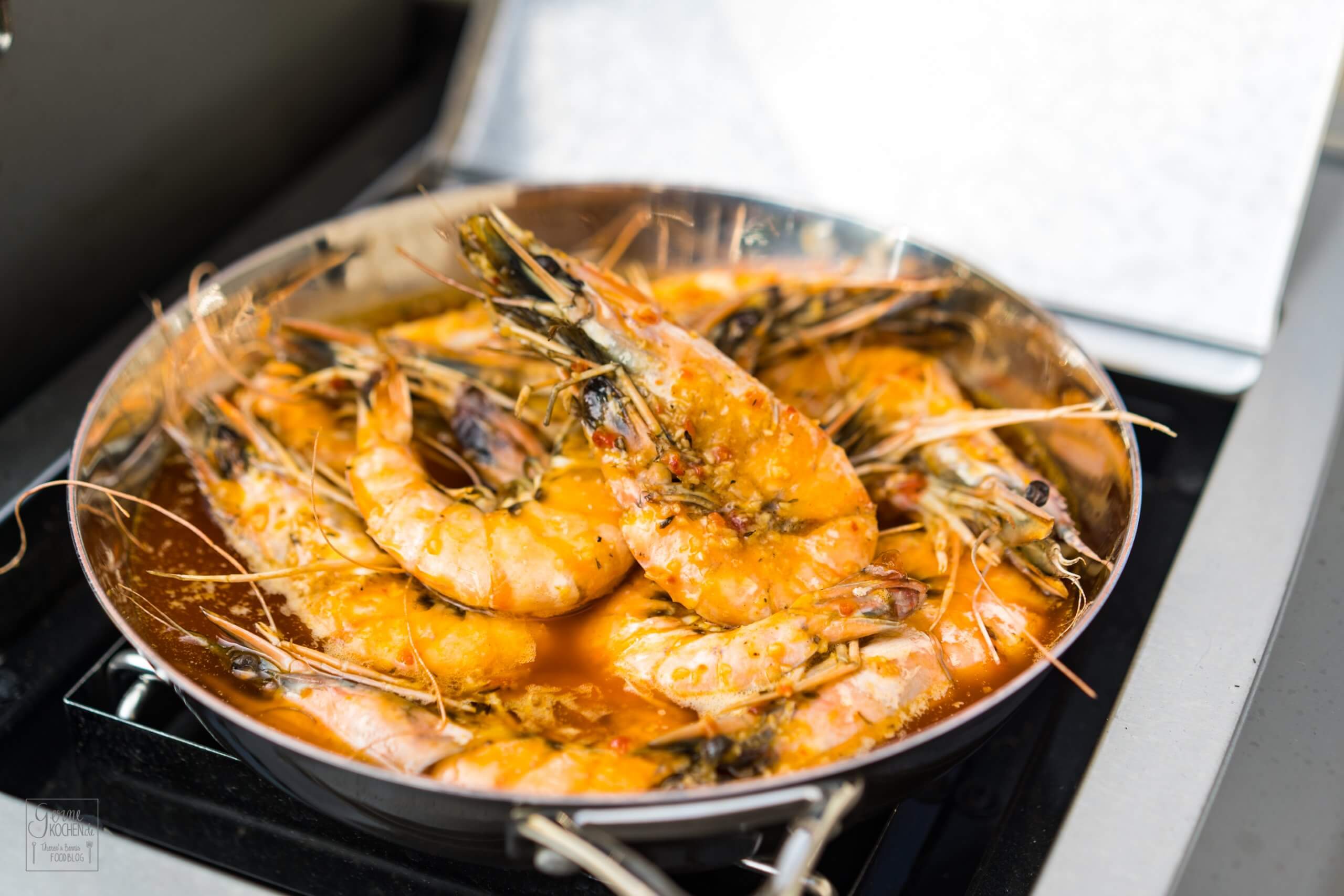 Garnelen in eine große Pfanne legen und kurz bei mittlerer Hitze anbraten. Dann bei schwacher Hitze die Soße darüber geben und alles 15 Minuten ziehen und garen lassen.