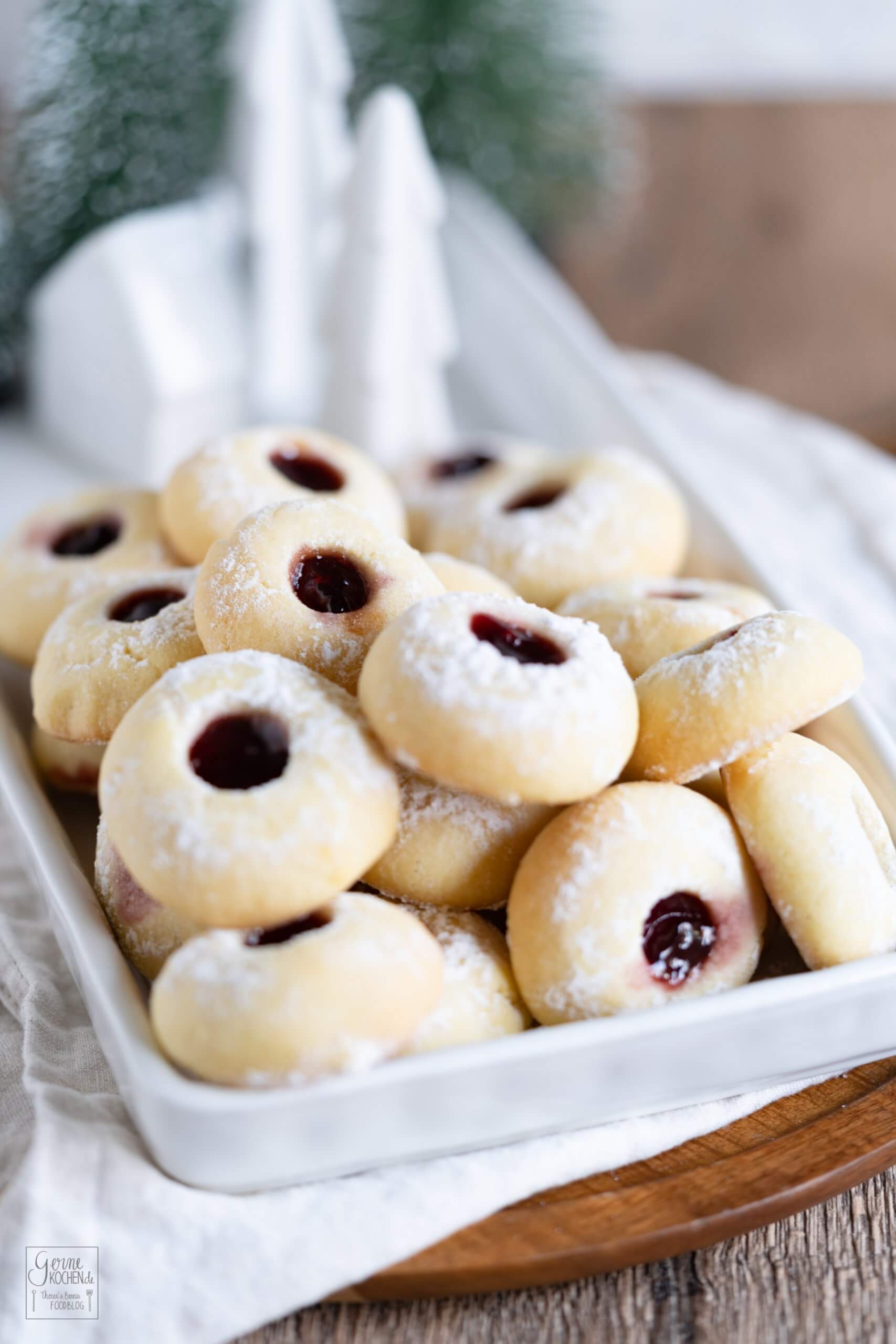 Das Stielende eines Holzlöffels in Mehl tauchen und in die Kugeln stechen, nicht ganz durch, aber tief. (Dünne Finger gehen sonst auch). Nun kann man die Marmelade erwärmen und in die Mulden der Kekse geben (das geht, wie gesagt, sonst auch hinterher).