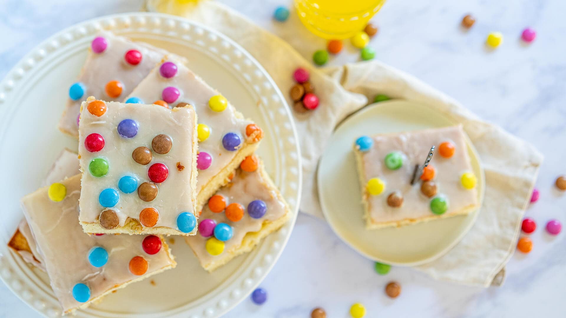 Den Zuckerguss herstellen, in dem ihr Fanta und Puderzucker vermengt. Auf dem kalten Fantakuchen verteilen, für 2 Minuten anziehen lassen, dann die Schokolinsen darauf verteilen.
