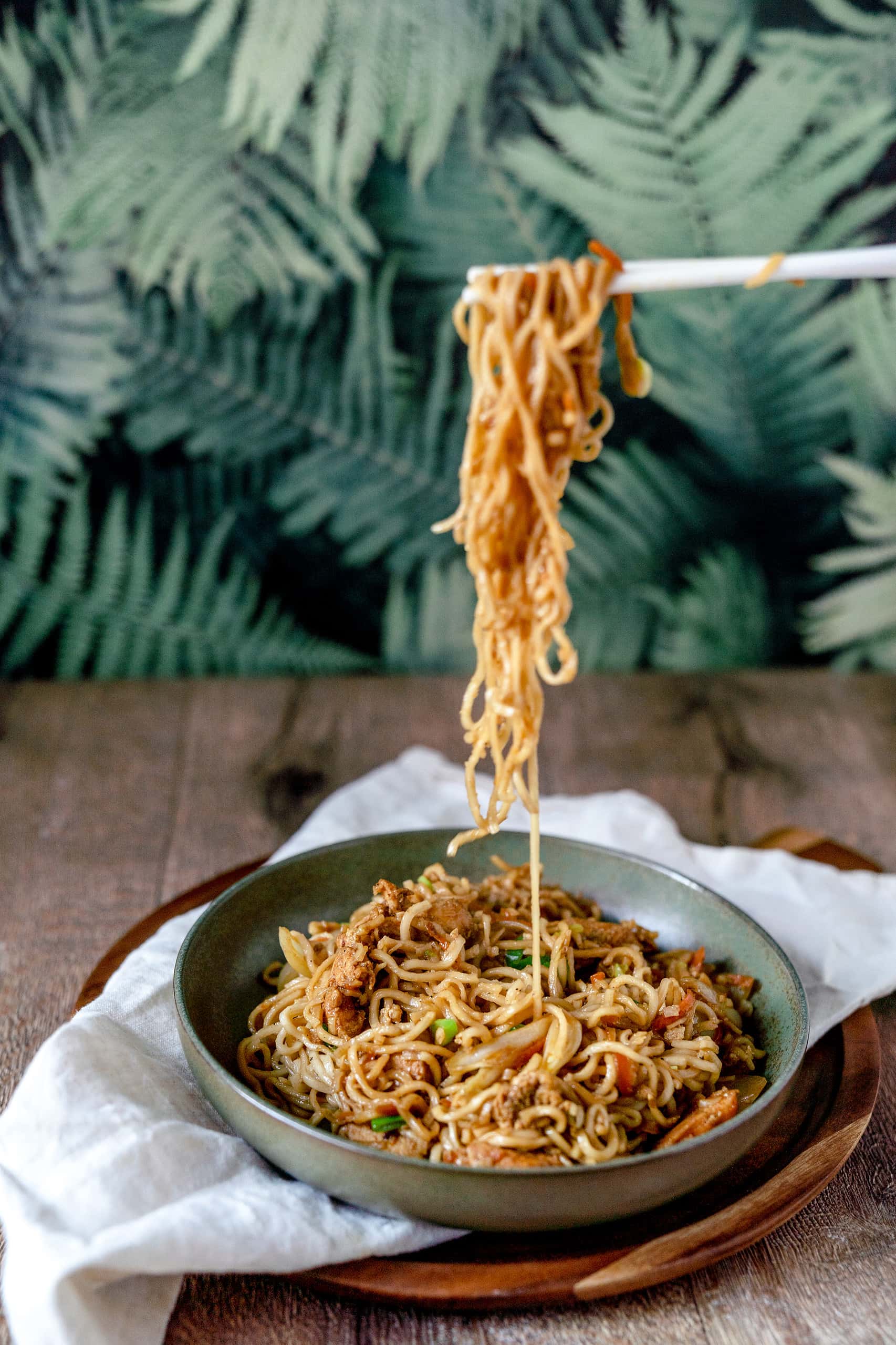 Nudeln mit in den Wok, etwas Sesamöl dazu, alles gut verrühren und für 2-3 Minuten anbraten. Dann mit Salz, Pfeffer und Sojasauce abschmecken, die Frühlingszwiebeln unterrühren und servieren