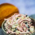 Wer es ganz schnell mag, gibt die Gurken und die Fleischwurst einfach in die Kenwood Cooking Chef in den Multi-Zerkleinerer mit der groben Reibe. So geht das in wenigen Sekunden.