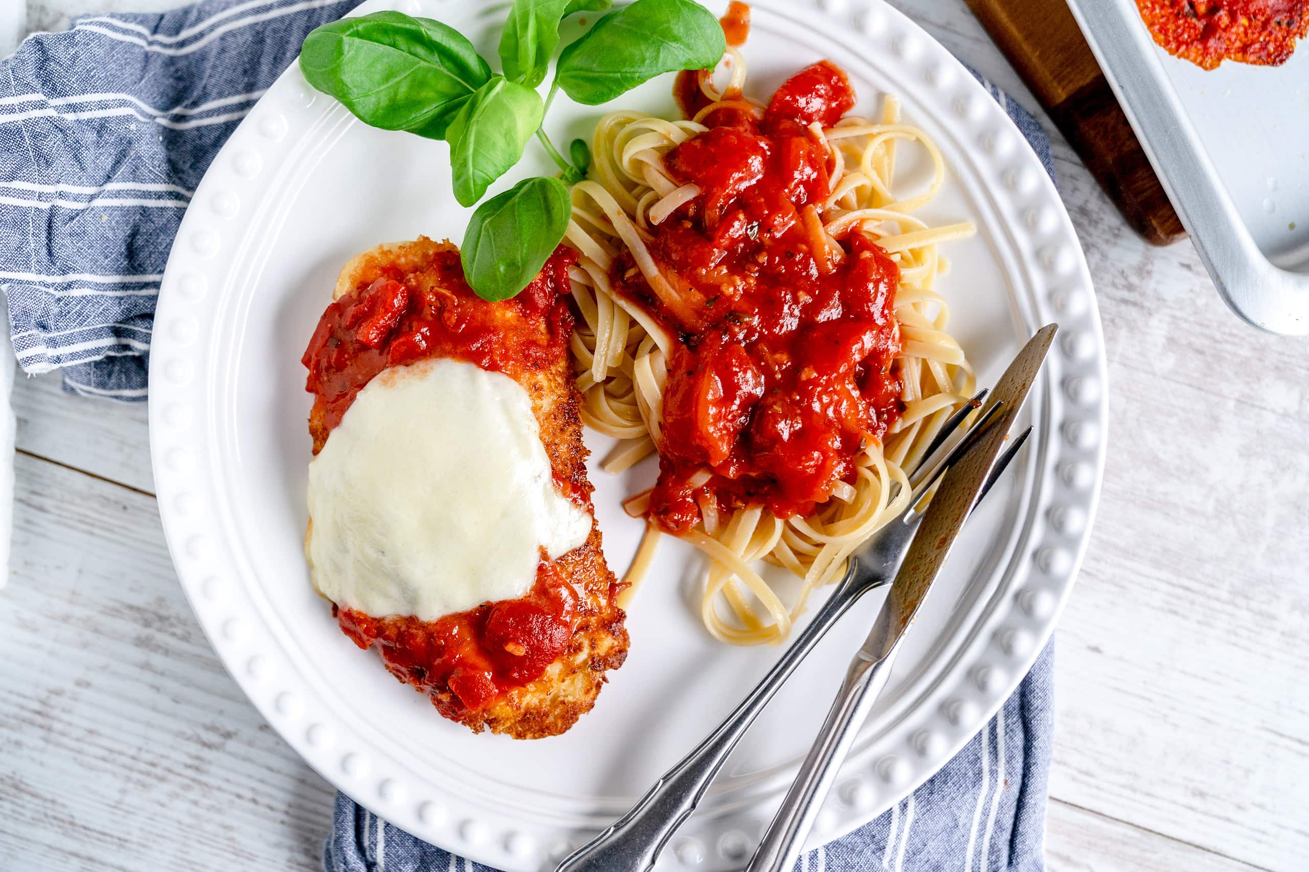 Jeweils einen Esslöffel Tomatensauce auf den Schnitzeln verteilen. Die Mozzarellakugeln in vier Scheiben schneiden und auf den Schnitzelchen verteilen.In den Ofen schieben, solange bis der Mozzarella schön geschmolzen ist.In der Zwischenzeit können die Nudeln gekocht werden. Die gegarte Pasta mit der restlichen Tomatensauce vermischen und zusammen mit den Hähnchenschnitzeln servieren.