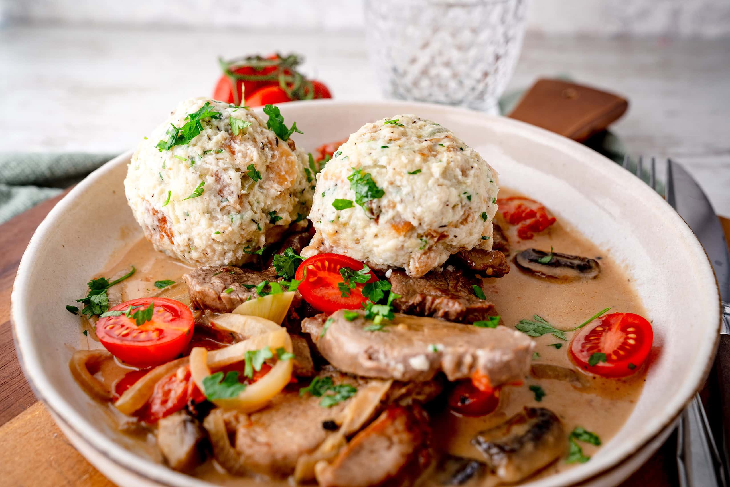 Südtiroler Käseknödel mit Ragout: Ein herzhaftes Festessen mit fluffigen Knödeln aus Raclettekäse, Ricotta und Weißbrot, perfekt ergänzt durch ein cremiges Kalbsragout mit Champignons und Tomaten. Ideal für besondere Anlässe oder als Sonntagsessen – dieses Gericht vereint traditionelle Küche mit moderner Raffinesse.