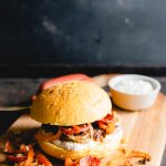 Burger Buns aufschneiden und die Innenflächen in Pfanne, auf dem Grill oder einem Toaster anrösten. Auf das Unterteil den Dip verteilen, den Patty darauf geben und dann mit den geschmorten Zwiebeln und der Paprika belegen.
