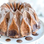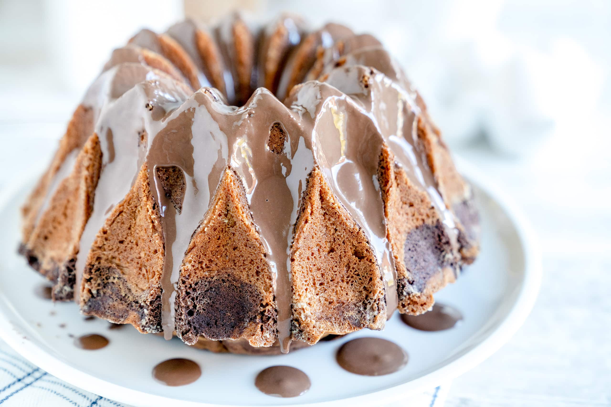 Den Marmorkuchen aus dem Ofen holen, zehn Minuten auskühlen lassen und auf einem Teller stürzen und komplett erkalten lassen.