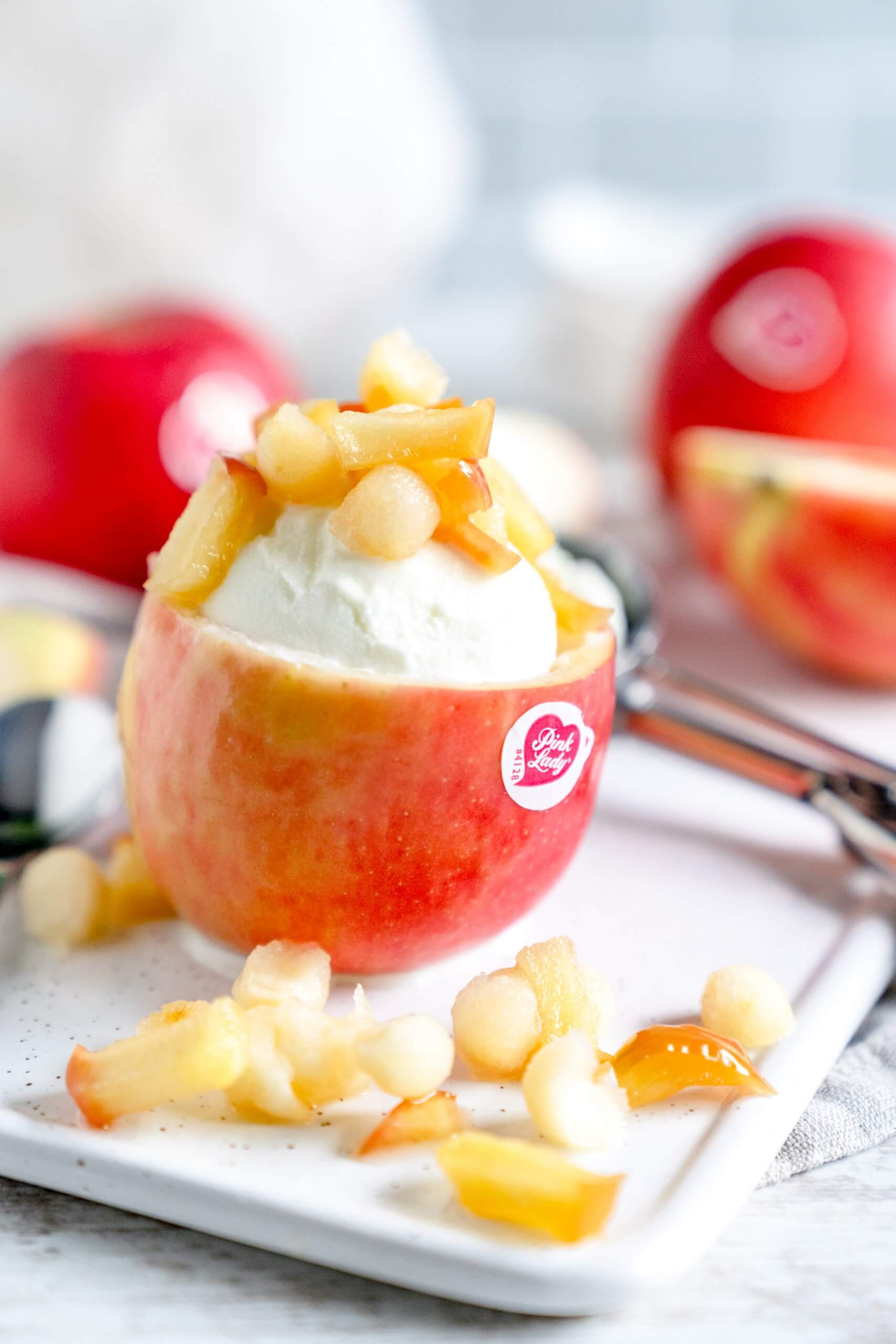 Sobald das Eis fertig ist, dies in den ausgehöhlten Apfel geben und das Apfel-Honig Topping darüber verteilen.