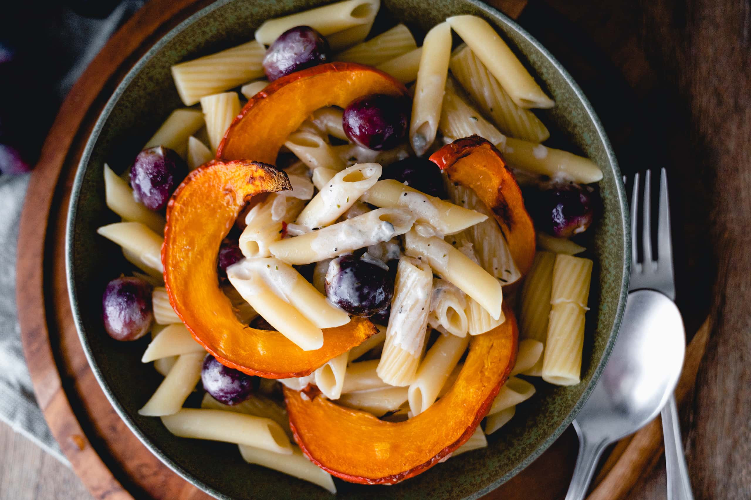 Nudeln mit geröstetem Kürbis und Gorgonzola-Trauben-Sauce
