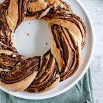 Verzwirble die zwei Teile miteinander zu einem Kranz und lege die Enden übereinander. Platziere zur Stabilisierung eine feuerfeste Schale in die Mitte des Kranzes. Lege den Kranz auf ein mit Backpapier belegtes Blech, pinsle ihn rundum mit geschmolzener Butter ein und backe ihn für 35 Minuten.