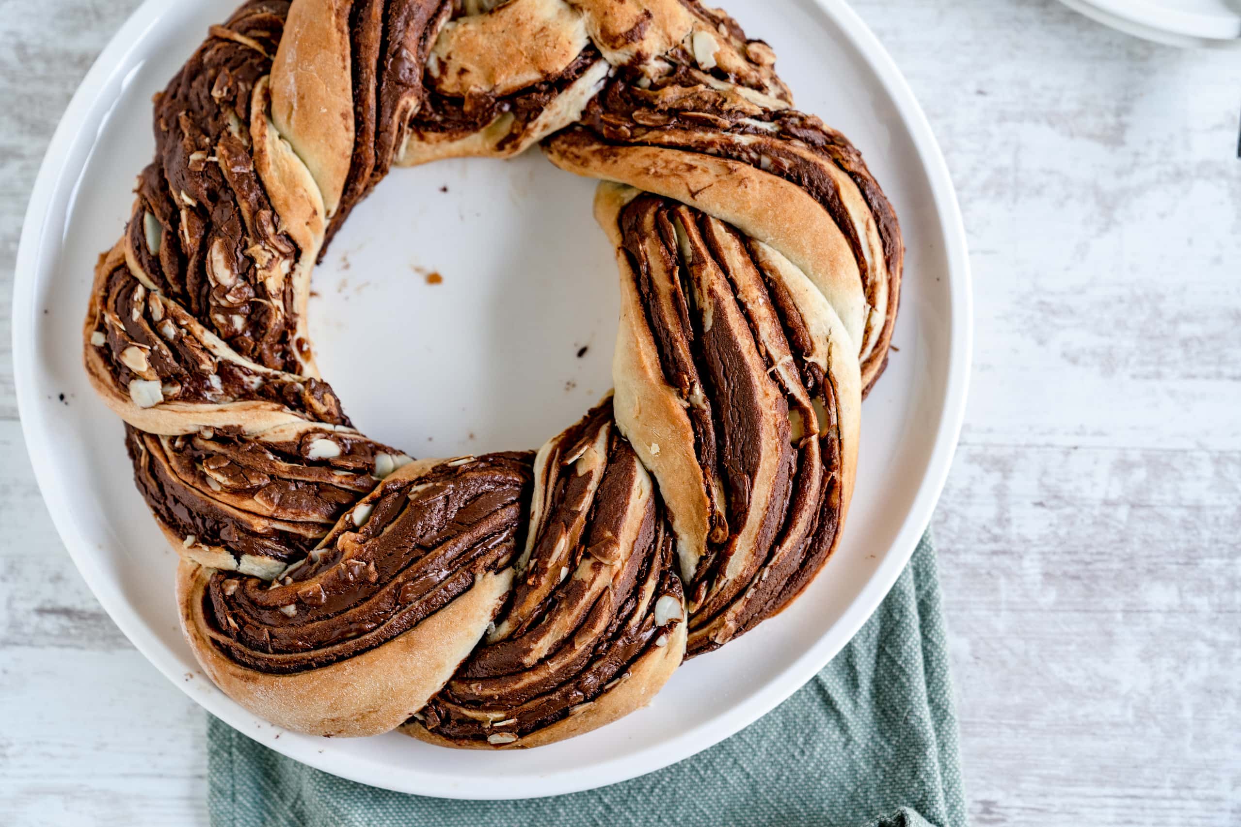 Heize den Ofen auf 150°C Umluft vor. Bestäube deine Arbeitsfläche mit Mehl und rolle den Teig zu einem Rechteck von 40x60cm aus. Verstreiche Nuss-Nougat-Creme darauf; falls sie zu zäh ist, kurz in warmem Wasser erwärmen oder in der Mikrowelle erhitzen.