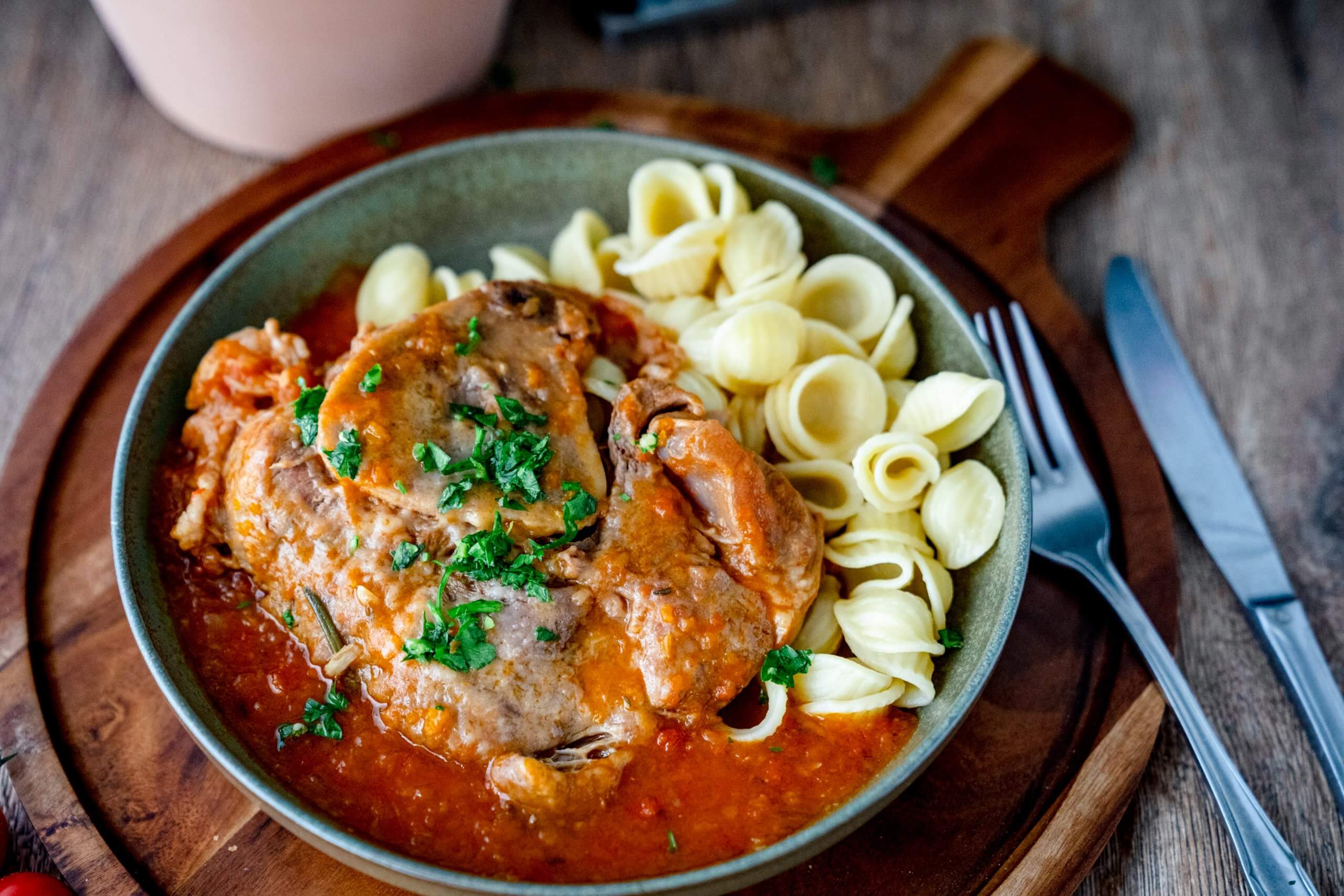 Ossobucco mit der Sauce und der Gremolata servieren.