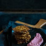 Pastinakenpuffer zusammen mit der Rote-Bete-Meerrettich-Creme servieren.