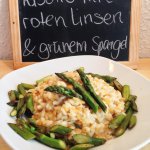 Danach die roten Linsen dazu, den Herd auf mittlere Hitze und nun immer so viel Brühe hinzufügen, dass der Risottoreis nicht ansetzt und leicht bedeckt ist. Dabei immer wieder rühren.