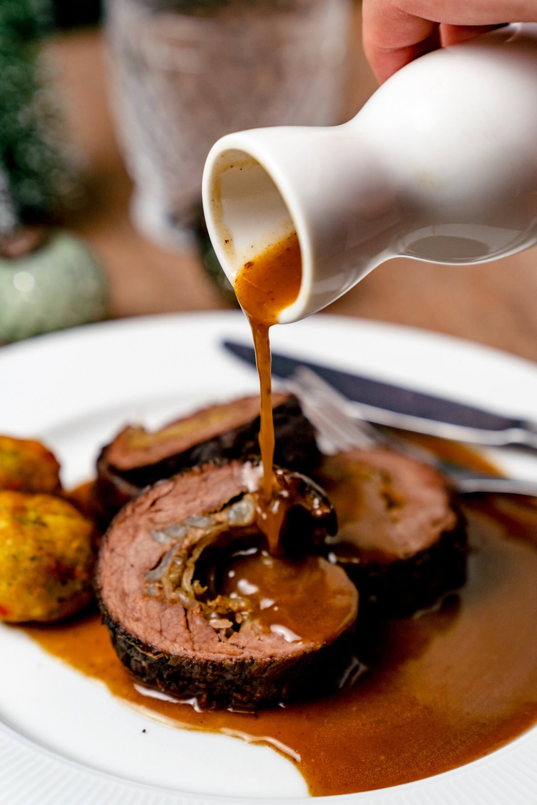Küchengarn entfernen und den Braten in Scheiben schneiden und mit der Sauce servieren.