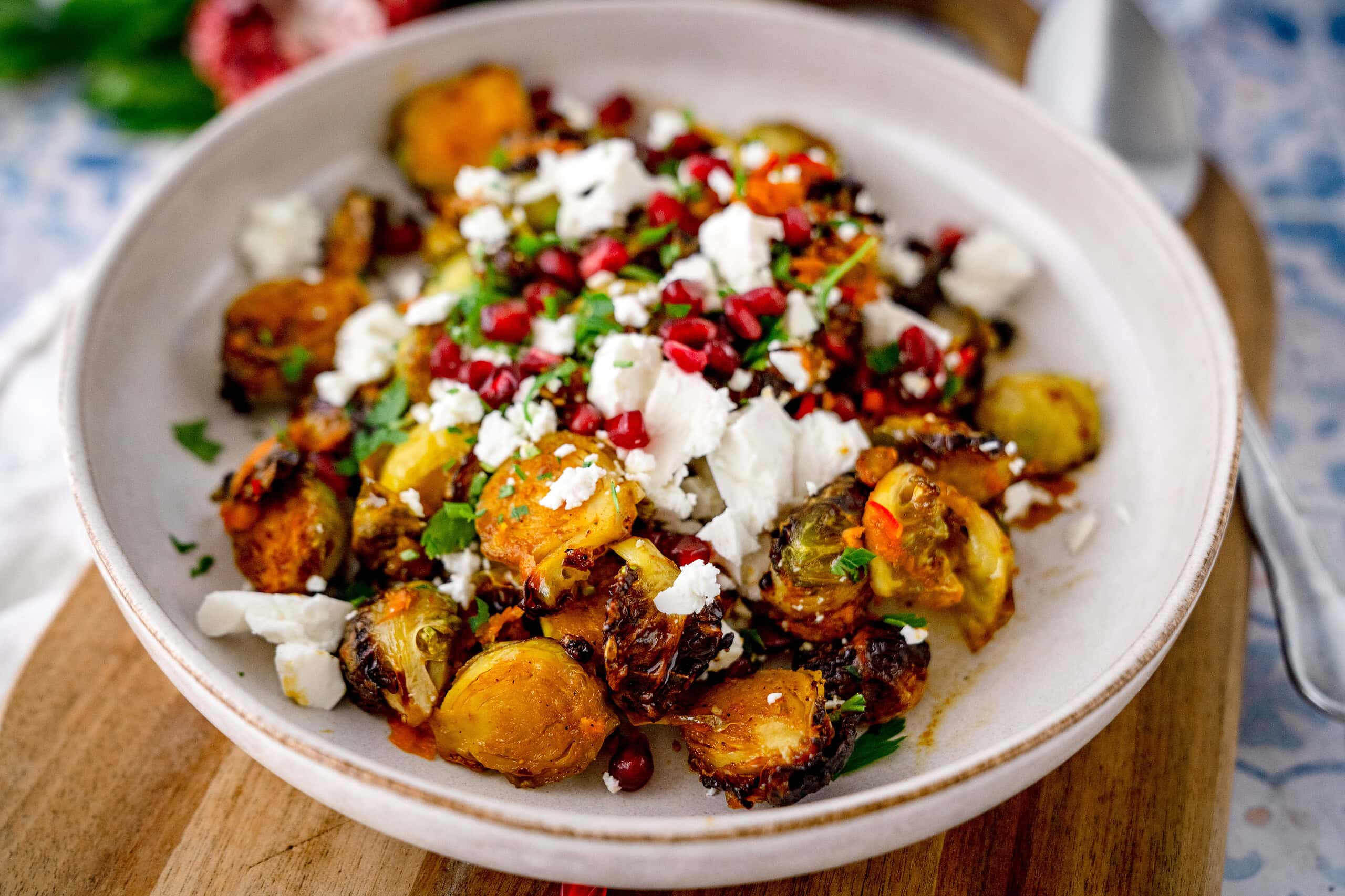 Feta, Petersilie und Granaapfelkerne über dem Rosenkohl verteilen und servieren.