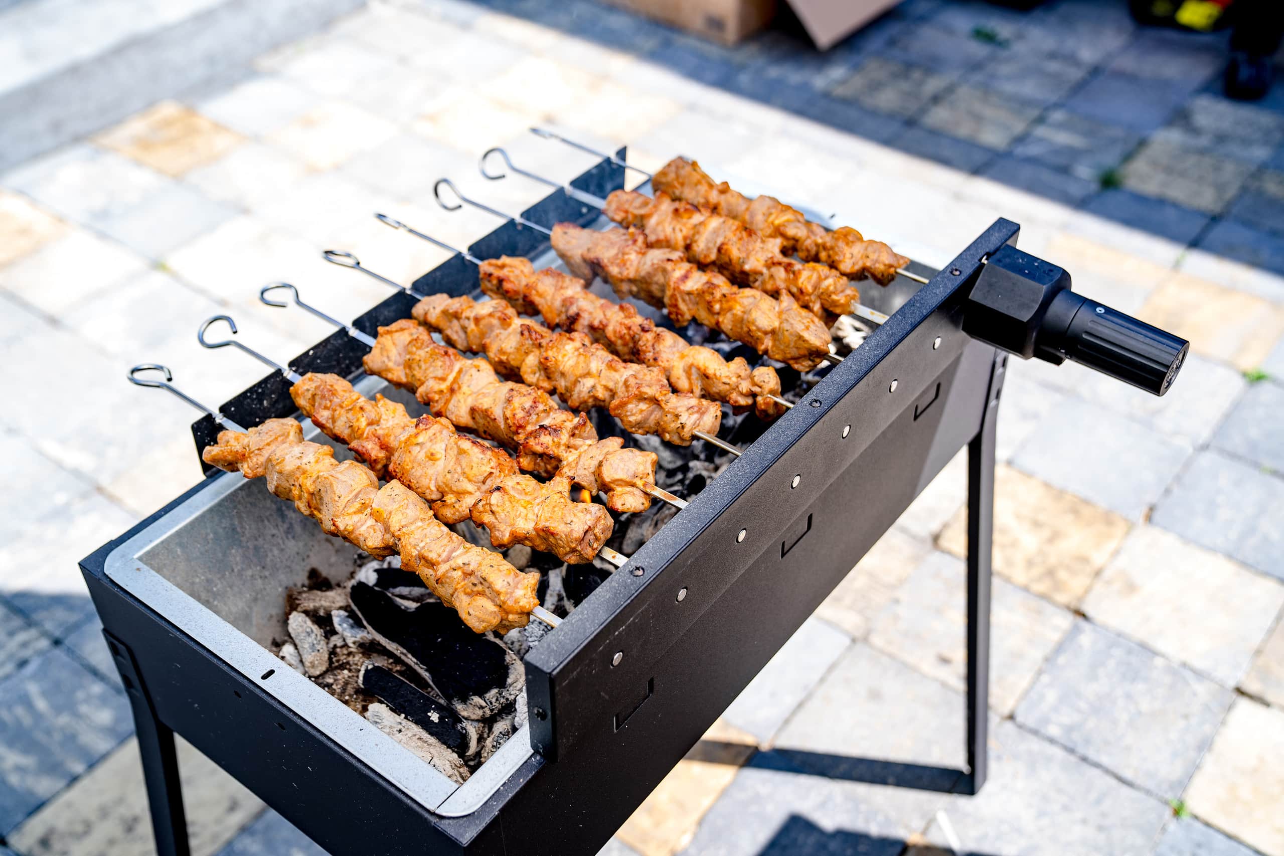 Fertig sind die Spieße, wenn sie von außen schöne Röstaromen haben. Dies hängt ab von der Hitze bzw. Menge an Kohle usw.