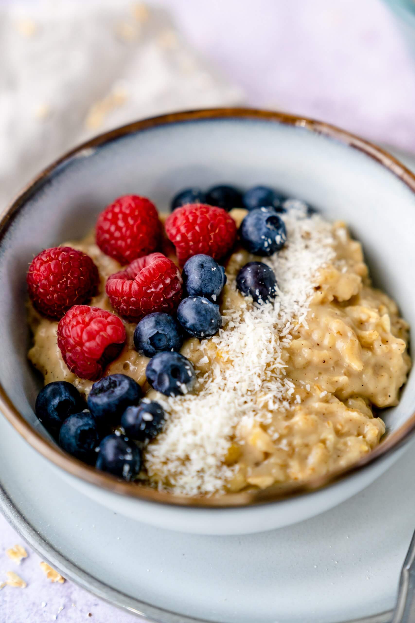 Den Joghurt in eine Schüssel füllen, den Porridge dazugeben und gut verrühren, abschmecken und ggf. etwas Ahornsirup nachgeben.