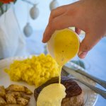 Nun machen wir uns an die Hollandaise. Dafür die Butter und die Trüffelbutter zusammen mit dem Weißwein in einem Topf schmelzen. Das Eigelb in einem kleinen Gefäß aufschlagen und nun die Buttermischung nach und nach unterrühren. Mit Salz, Pfeffer und etwas Zitrone abschmecken und beiseite stellen.