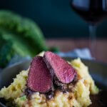 Dann Stampf mit der Sauce (die mittlerweile gut eingekocht sein sollte) und den Rehrückensteaks anrichten.