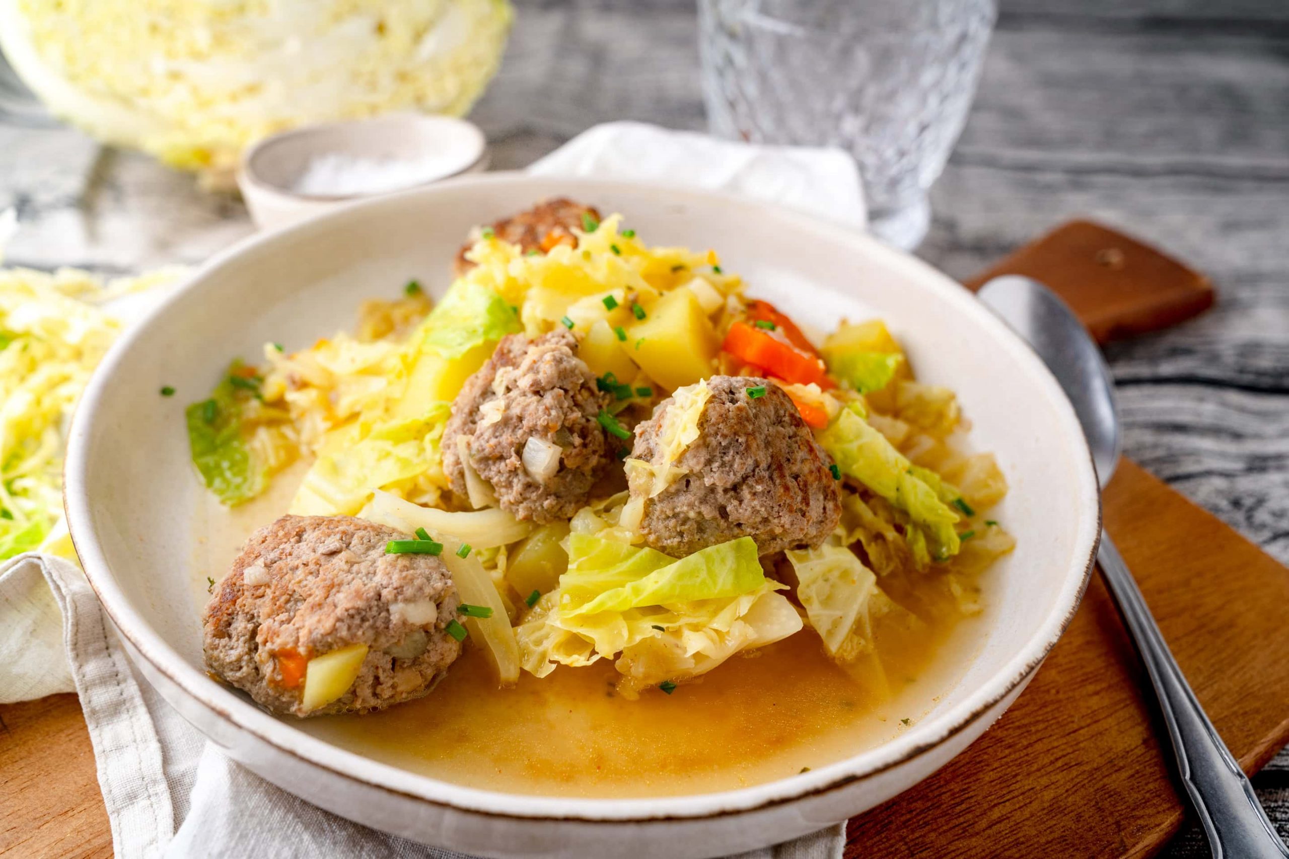 Wirsingtopf mit Hackbällchen: Ein einfacher, herzhafter Eintopf, der perfekt für kalte Wintertage ist. Mit aromatischem Wirsing, saftigen Hackbällchen, Kartoffeln und Möhren in einer würzigen Gemüsebrühe wird er zum Wohlfühlgericht für die ganze Familie. Das Rezept ist schnell gemacht, flexibel anpassbar und überzeugt mit seinem vollen Geschmack.