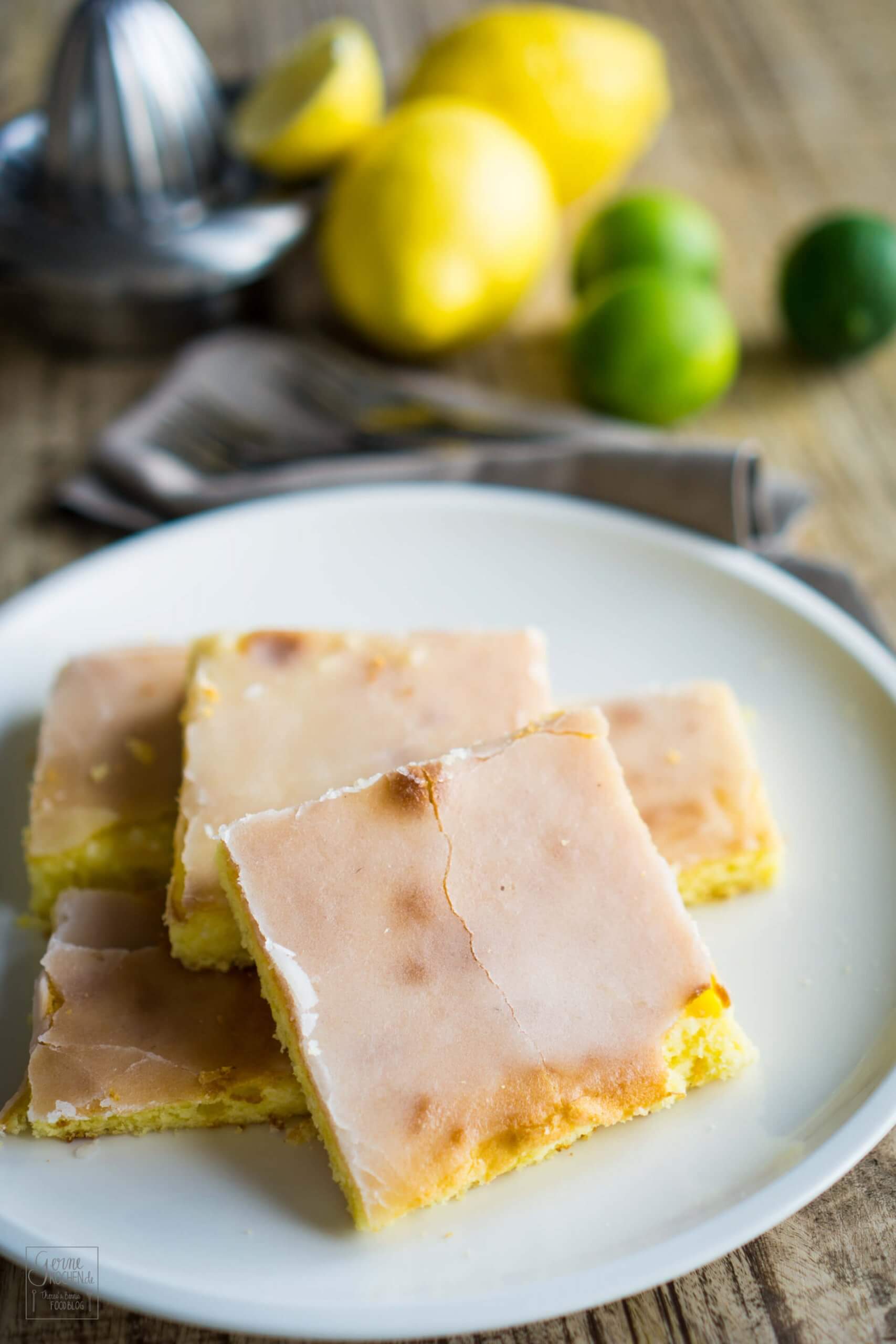 - Kuchen aus den Backofen nehmen und die angegrillten Limetten und eine Zitrone auspressen und den Saft mit dem Puderzucker verrühren. Dies dann auf den warmen Kuchen verteilen und warten bis alles abgekühlt ist.